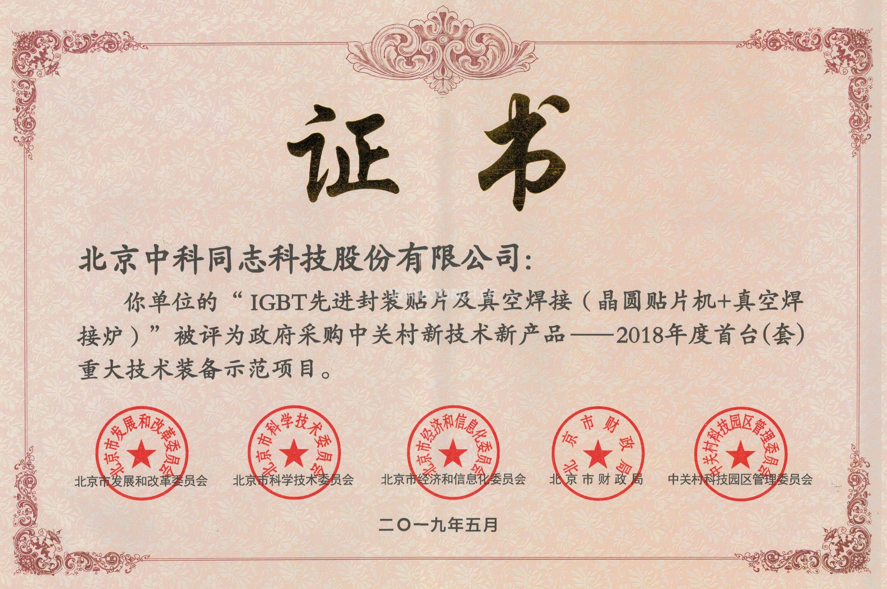 2019年度中關(guān)村國(guó)家自主創(chuàng)新示范區(qū)首臺(tái)(套)重大技術(shù)裝備示范項(xiàng)目技術(shù)評(píng)審工作已經(jīng)結(jié)束,北京中科同志科技股份有限公司研制的“IGBT先進(jìn)封裝貼片及真空焊接”通過(guò)專(zhuān)家評(píng)審,被評(píng)為政府采購(gòu)新技術(shù)新產(chǎn)品——2018年度首臺(tái)(套)重大技術(shù)裝備示范項(xiàng)目。