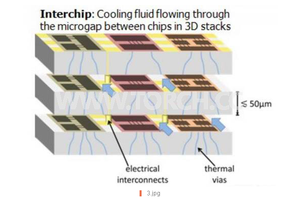 為了解決3D芯片堆疊時的液體冷卻問題,美國國防部先進研究計劃署(DARPA)與IBM、喬治亞理工學院合作展開芯片內/芯片間增強冷卻計劃,如今已經開發出一種使用絕緣介電質制冷劑(以取代水)的途徑。